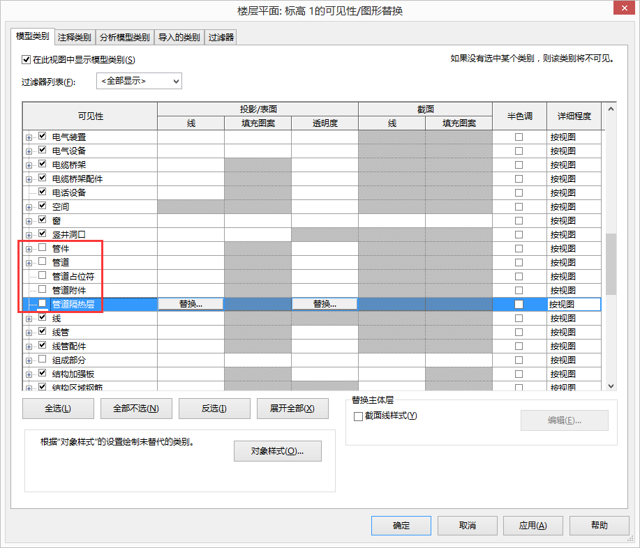 机电模型搭建时,考虑到后期管线碰撞及优化,往往将各个专业在一个项目文件中绘制。此时,可以根据当前绘制的专业不同,对不需要的构件进行隐藏,如绘制电缆桥架时,将可见性视图设置中的管道类别隐藏,如图2所示,可加快模型运转速度。