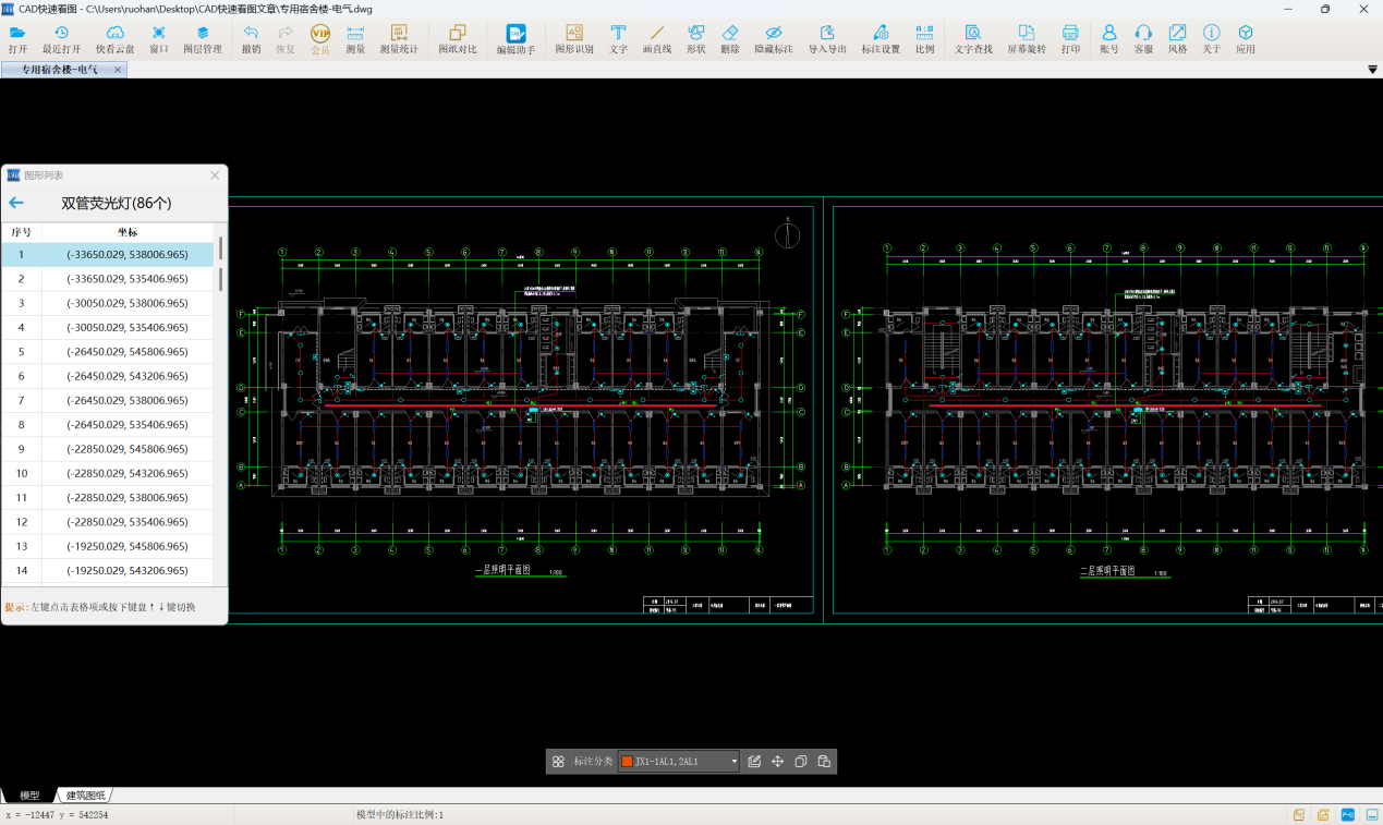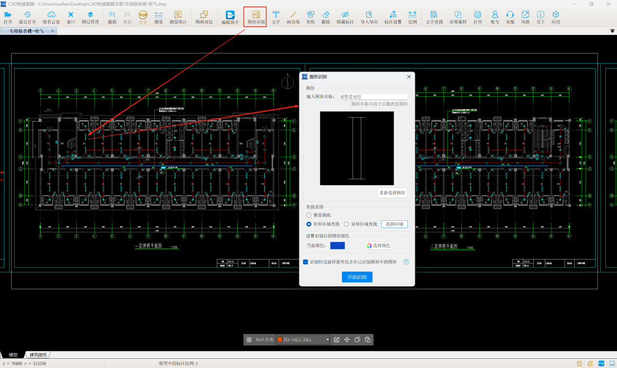 以双管荧光灯为例进行分析,使用软件的【图形识别】功能,选择平面图中的图形,在弹出的对话框里命名为“双管荧光灯”,查找范围为一层和二层平面图,点击开始识别,图形变蓝,弹出图形列表,数目为86个。