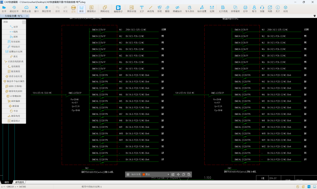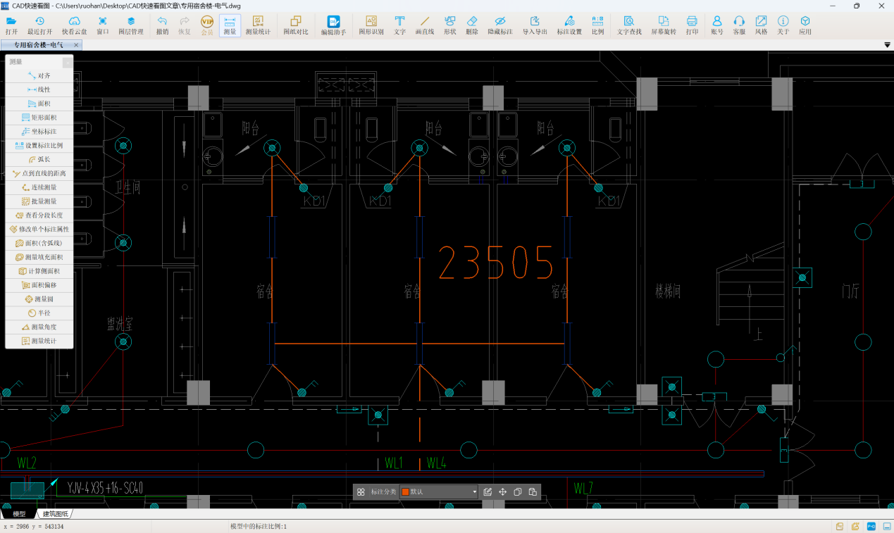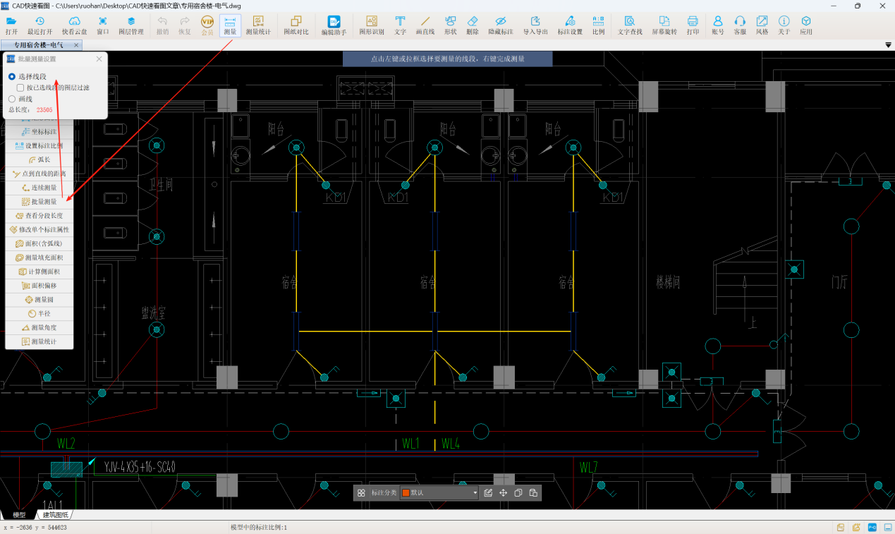 电气安装图纸上会涉及多条管线,一个个量取汇总比较麻烦,CAD快速看图的【批量测量】功能可以批量量取相同管道长度,直接测量汇总长度,节省汇总时间。