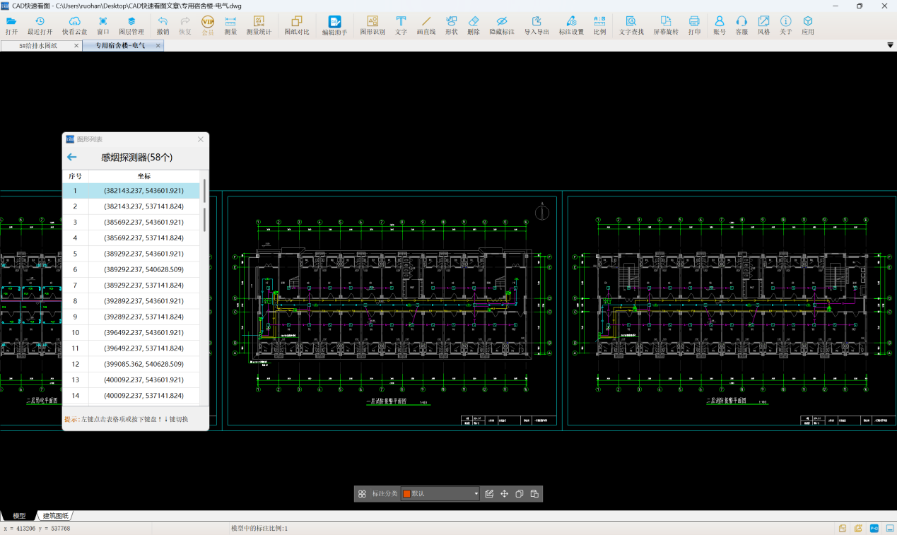 以感烟探测器为例,进行识别,框选范围为一层和二层消防报警平面图,得到感烟探测器的数量为58个。