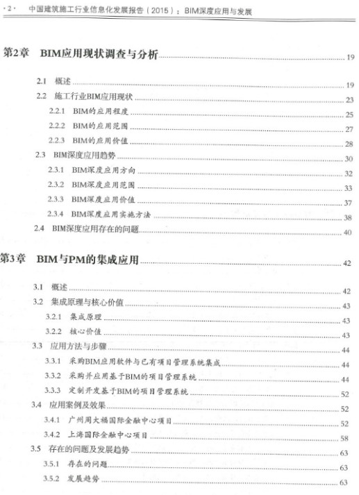 这是我们第二次组织编制中国建筑施工行业信息化BIM应用与发展的报告了,为什么要如此着力呢?是因为又有了十分可喜的深度应用与发展,成效和意义很大,及时向行业、向关注BⅠM在我国建筑施工行业应用发展的人们介绍,十分急需,也十分必要。 随着BIM技术应用的不断深化,BM应用已经从单一的BIM软件应用转向多软件集成应用,从桌面应用转向云端和移动客户端,从单项应用转向综合应用,并逐步实现了BIM与物联网云计算、CS等技术的融合应用。《中国建筑施工行业信息化发展报告(2015):BIM深度应用与发展》在《中国建筑施工行业信息化发展报告(2014):BIM应用与发展》的基础上,就BIM的深度应用和发展展开论述,以期进一步引领中国建筑施工行业BIM技术应用的发展方向,并为行业深度应用BIM树立风向标。