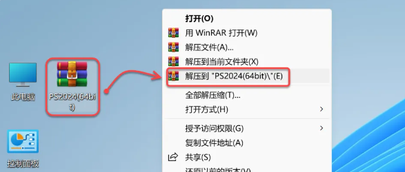 1.鼠标右击【PS2024(64bit)】压缩包(win11及以上系统需先点击“显示更多选项”)【解压到 PS2024(64bit)】。