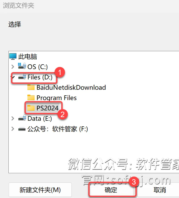 4.①点击需要将软件安装的磁盘位置(如:D盘)②新建一个【PS2024】文件夹并选中③点击【确定】。