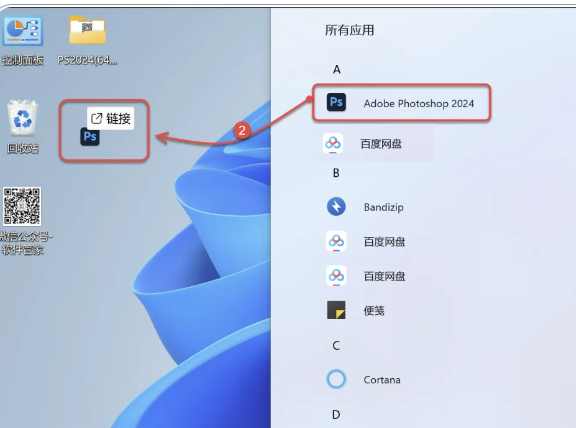 8.创建桌面快捷方式:①点击桌面任务栏中的【开始图标】>点击【所有应用】②将【Adobe Photoship 2024】图标拖到电脑桌面。