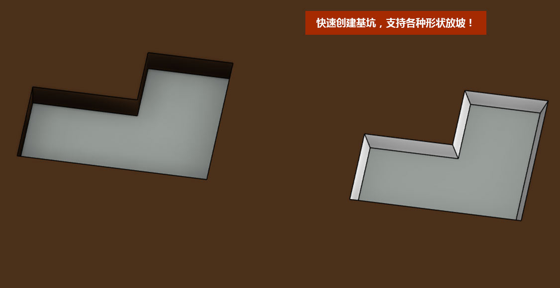 建模大师支持绘制任意形状的基坑,根据设置的放坡角度,一键完成基坑创建!