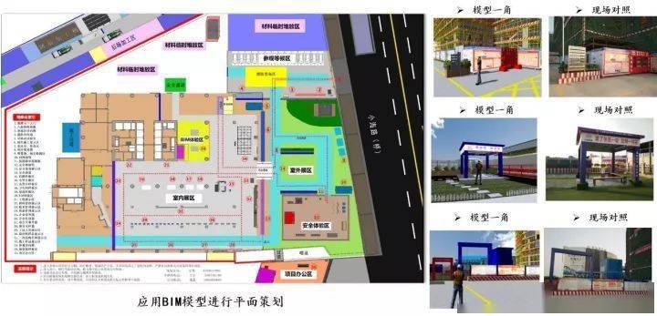 由于本项目施工可用场地小,材料堆放、临时设施、车辆进出管理等布置方面较为困难。BIM中心应用BIM模型进行场地平面策划,并利用三维漫游动画进行样板工地策划。本项目为省级观摩项目,预先在BIM软件中将观摩各类素材、路线规划等进行虚拟布置,有助于管理层对观摩方案的科学决策,避免不必要的浪费。