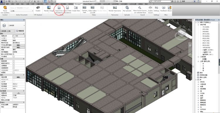 2、返回到Revit中,依然在Enscape选项卡中找到带有exe图标的选项,点击导出exe。