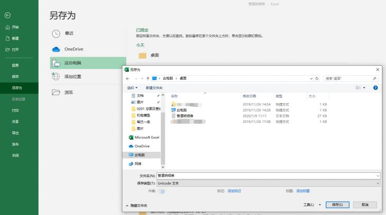 04、在Excel中依次点击“文件-另存为”按钮,选择要保存的位置,如图所示。默认的保存类型是Unicode文件,将其改成Excel工作簿,点击保存即可。