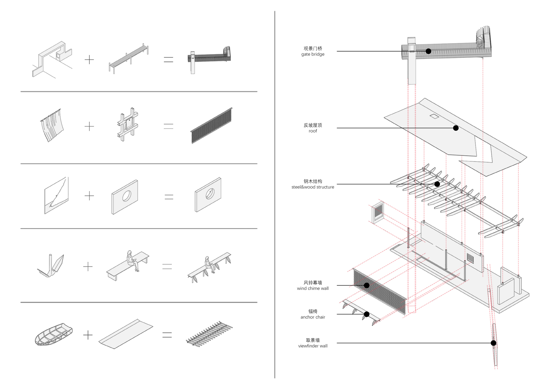 为了让这段等候时间不会无聊或陷入两种不同群体之间的尴尬,我们希望提供一些可供消磨时间的内容,而由于场地空间的有限,我们将内容着眼于外部的自然环境,发掘东角渔村细小的动人之处,通过不同的设计手法让这些元素在公交站汇集,形成人与景动态交互的聚集之所。