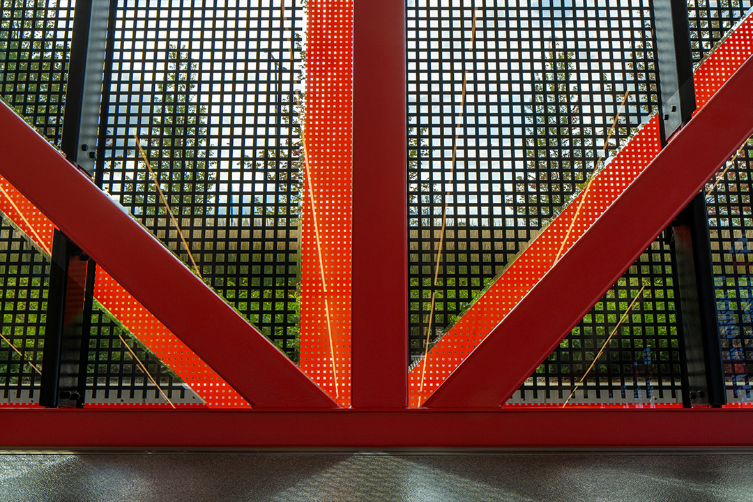 This design is inspired by the shape of the World War II-era landing craft. The building's exposed steel-frame structure is painted a bright red – the color of courage, and clad in highperformance glass. Inside, A partial-height glass partition reveals the private workspaces of curators and archivists to the public, offering a unique glimpse into the intricate process of preserving history.