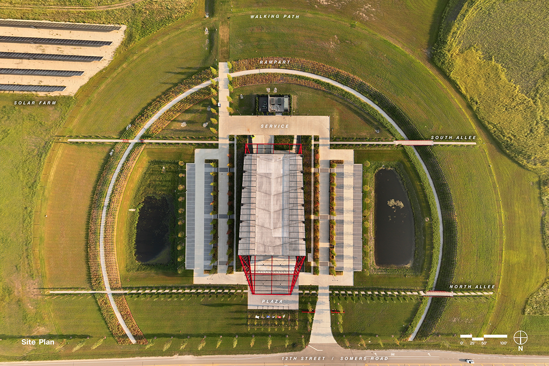 Spanning 17.5 acres, the grounds of the Pritzker Military Archives Center reflect a deep commitment to environmental preservation. With less than 4% of the total area allocated for buildings, the landscape planned by our project partner O2 Design ensures the protection of the nearby wetlands. The community area includes green walking and biking trails, as well as dedicated picnic spots.