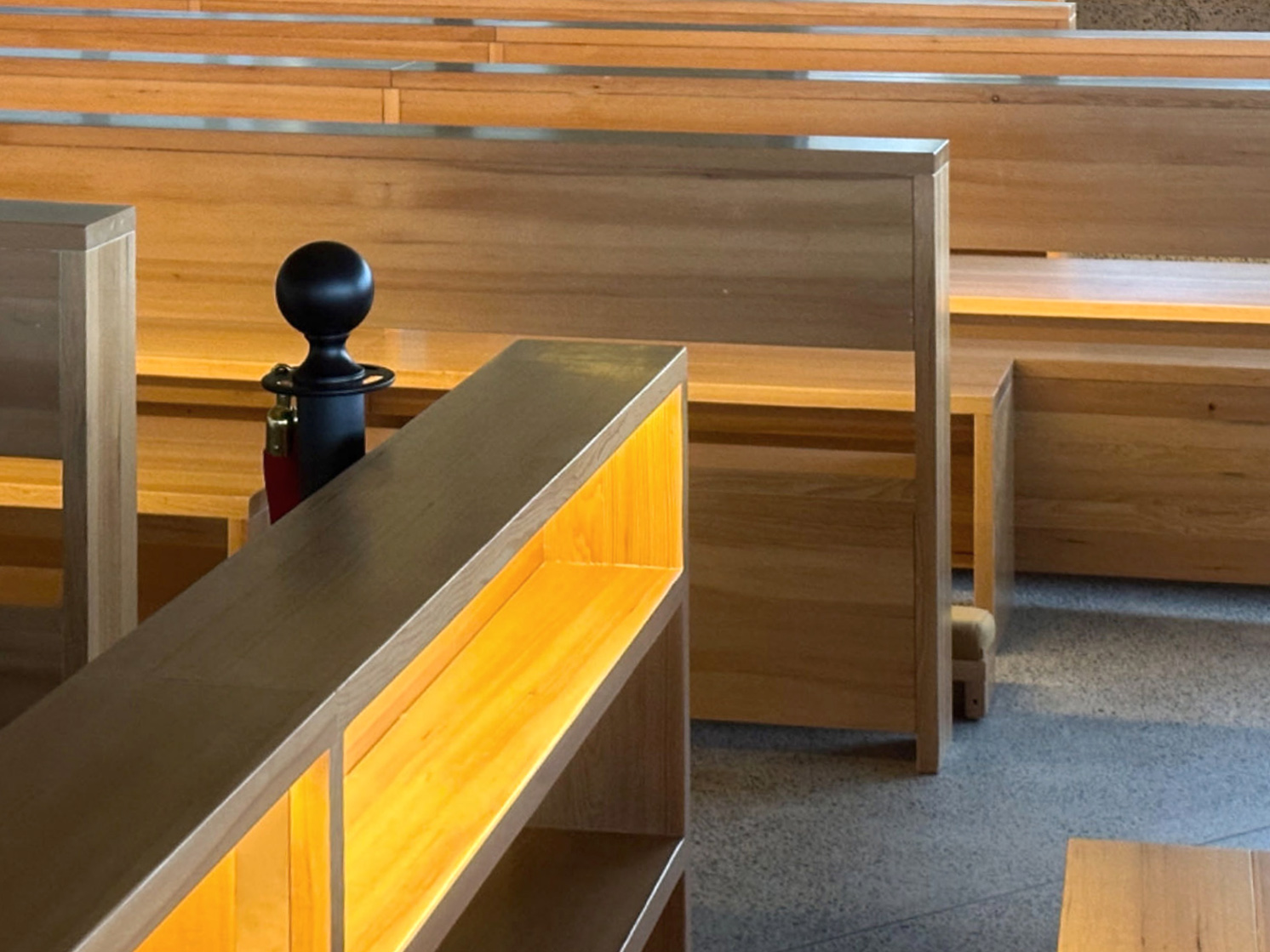 礼拜堂嵌入大地的部分,是举行祈祷弥撒的空间,跪凳向心布置,中心是大理石祭台,祭台上摆放苦像和弥撒用品。