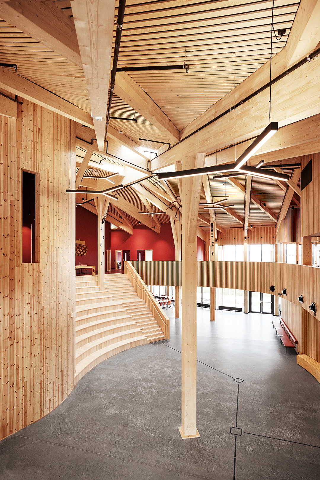 The façade of the building is made of standing wood clad in ore pine. The massive roof measures 4930 m2 and is clad with 34,000 meters of kebony. The Alta slate stone on the theatre's gable wall has been reused from the village's old primary school, which has been demolished.