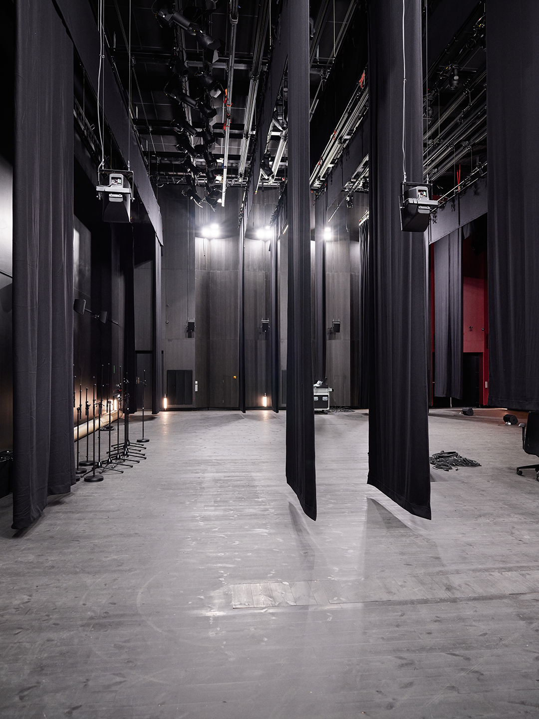 The new shared space has a branching shape, with a main entrance and vestibule located at its center, creating a gathering place for both the school's and the theater's users. From here, the building body stretches in three directions – with one wing each for the theatre, workshops and teaching rooms, and the school's administration.