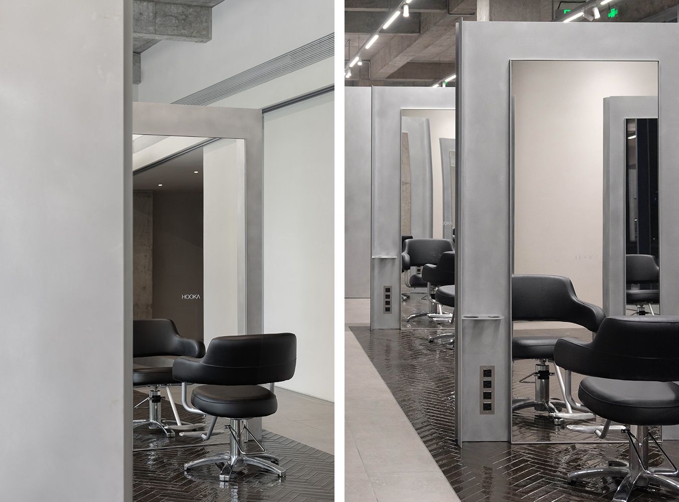 A series of removable door panels are a dynamic factor in activating the space, and through this flexible and adjustable design, the layout of the space can be diversified and instantly adjusted according to the actual needs. The panels not only act as temporary partitions to enclose specific areas (e.g. the shampoo area), effectively minimising unwanted visual distractions, but also create different levels of privacy according to customer needs.