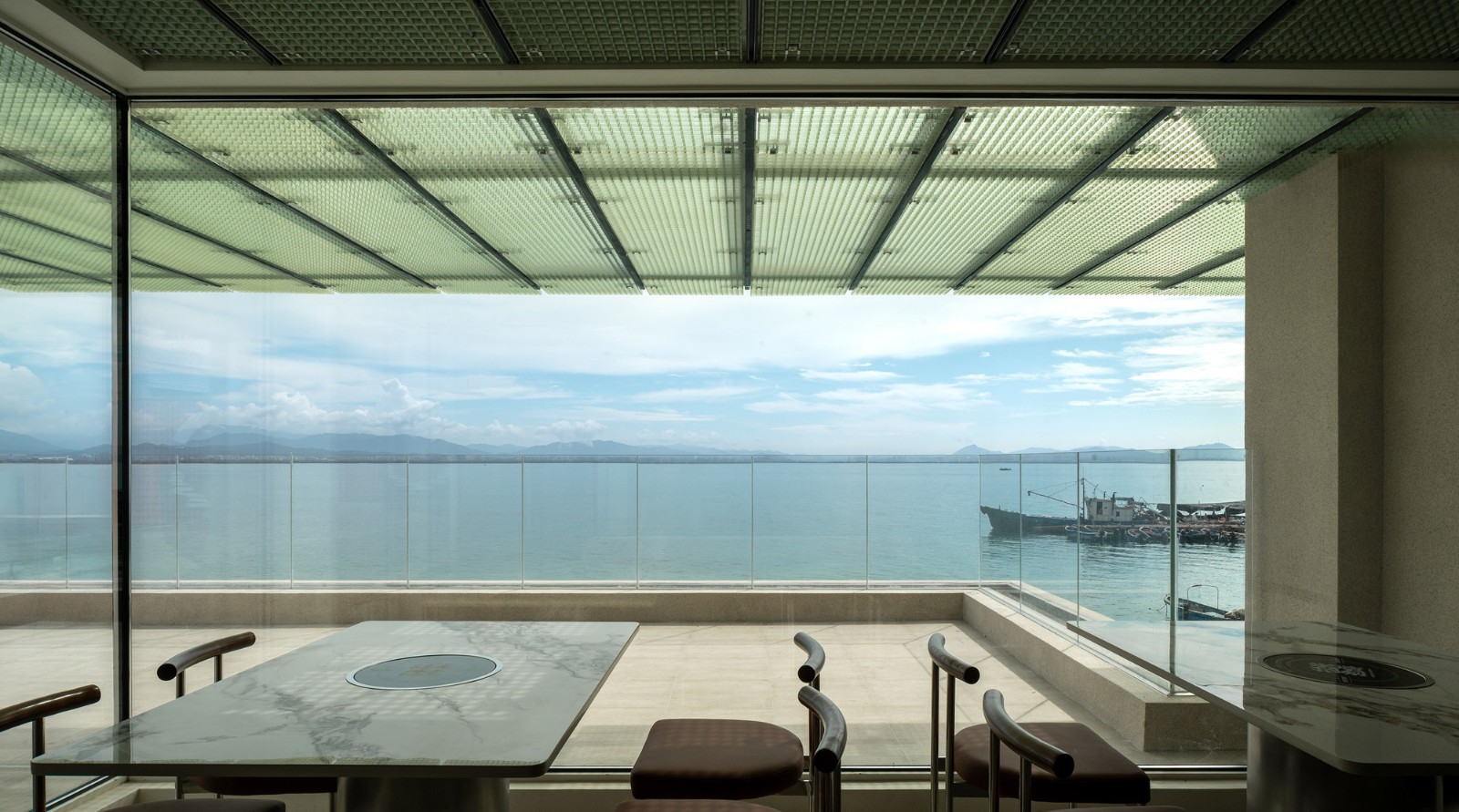 所以我们尽量把海景优势放大,面向海的立面尽量只有玻璃,把一切可能干扰的装饰因素统统去掉,同时室内座位的布置都平行于大海,让在座的客人尽可能的享受海景;天花系统强调垂直大海的线条,方便梳理天花管线的同时,也加强空间冲向海面的指向性。