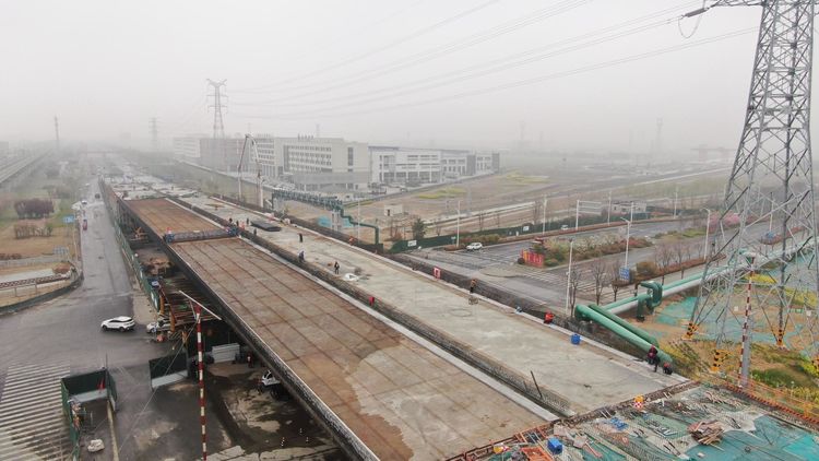 港城路上跨铁路专用线桥梁工程:起于港城路与康程路交叉口以东,沿港城路向东,跨越在建铁路专用线、云帆大道,止于港城路与中顺路交叉口,全长约1.36公里,设计桥梁宽度33.65米,建设内容为桥梁、照明、排水、交安等附属工程。目前,项目现浇箱梁已完工,正在进行护栏和路基工程施工。