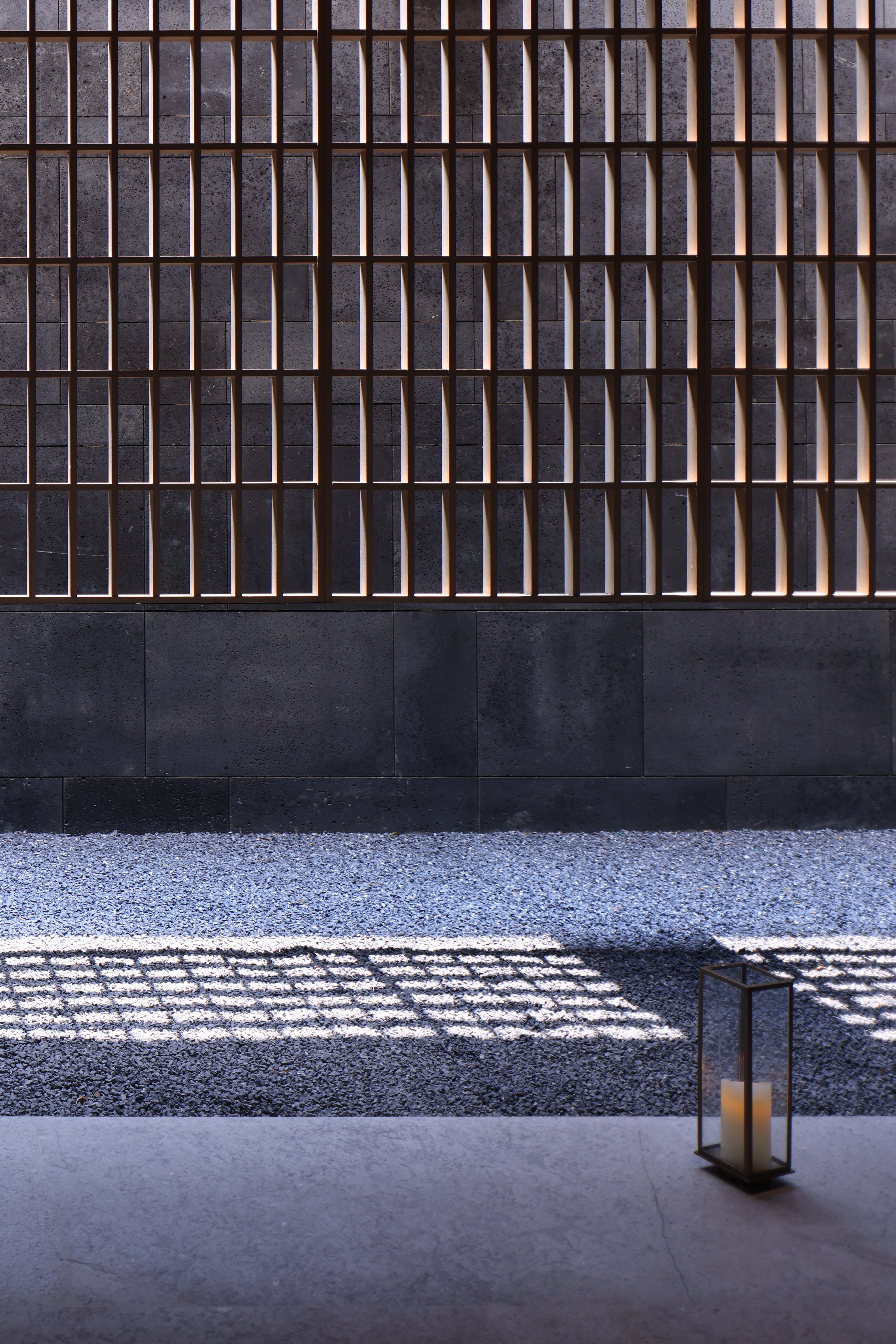 一段外廊成为归家的前奏——火山岩构成的外墙或塑造出一段框景洞口,捕捉外部的景观;或组合为一面屏风,让光线从缝隙中透入。这些明暗变化为颀长的空间赋予节奏,并成为外部与内部的调和者。