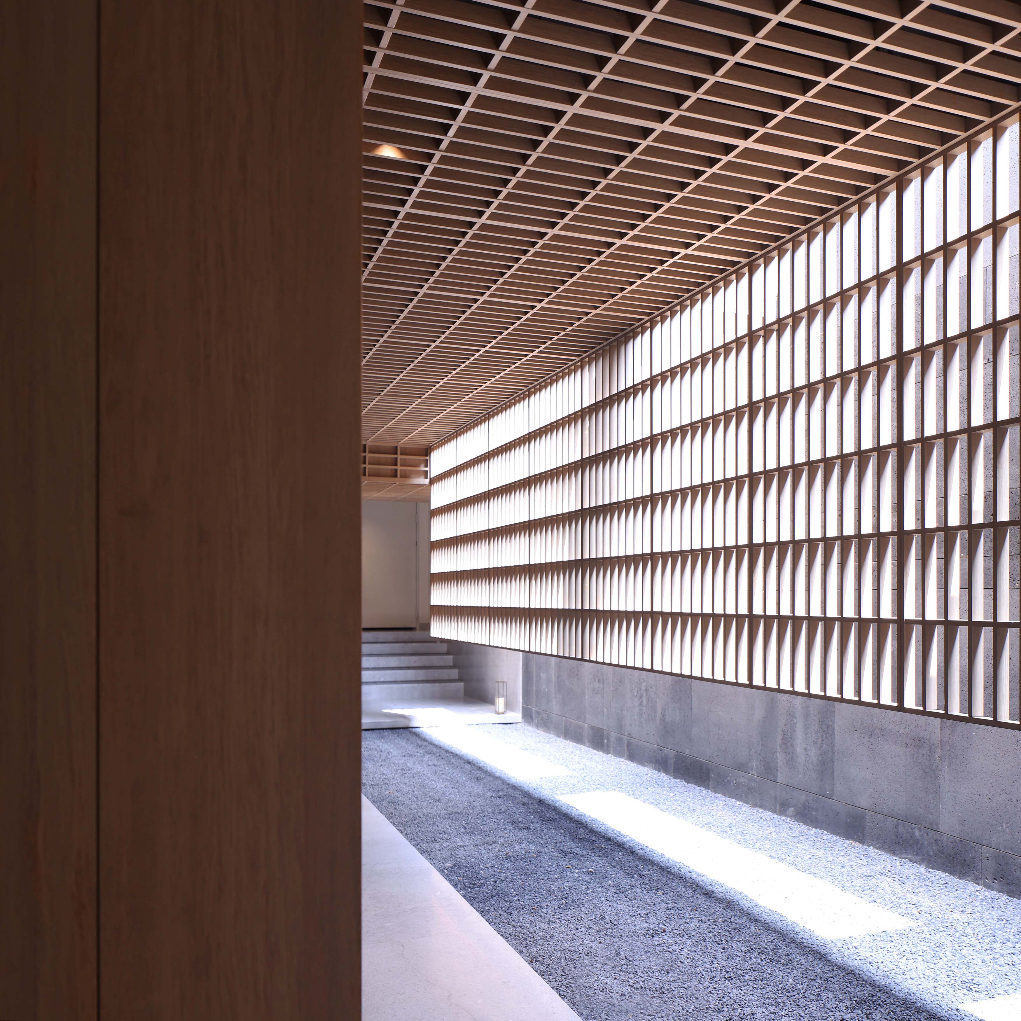 由住宅延伸向下的剪力墙与连梁并没有给平面带来灵活布置的可能,更有大量的竖向管道与电箱需要隐蔽。室内设计依旧顺势而为,将入户大堂分成两个部分:入口前厅处剪力墙阵列排开,举起的竹木格栅仿佛撑开的树冠,庇护出一系列口袋空间用于临时休憩与等候;深处的庭院引入天光与山风,连接着两栋住宅的电梯厅。二者之间,一段不长但有力的走道,在视线尽头框画出各自的场景。