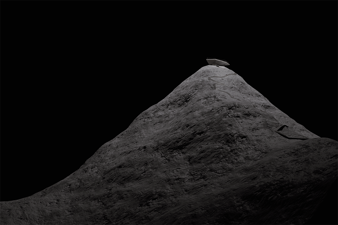 设计未塑造传统意义上的“建筑”,而是以微微倾斜的厚重混凝土板覆盖山体,模拟岩石自然生长的形态,强调精神层面的场所构建。