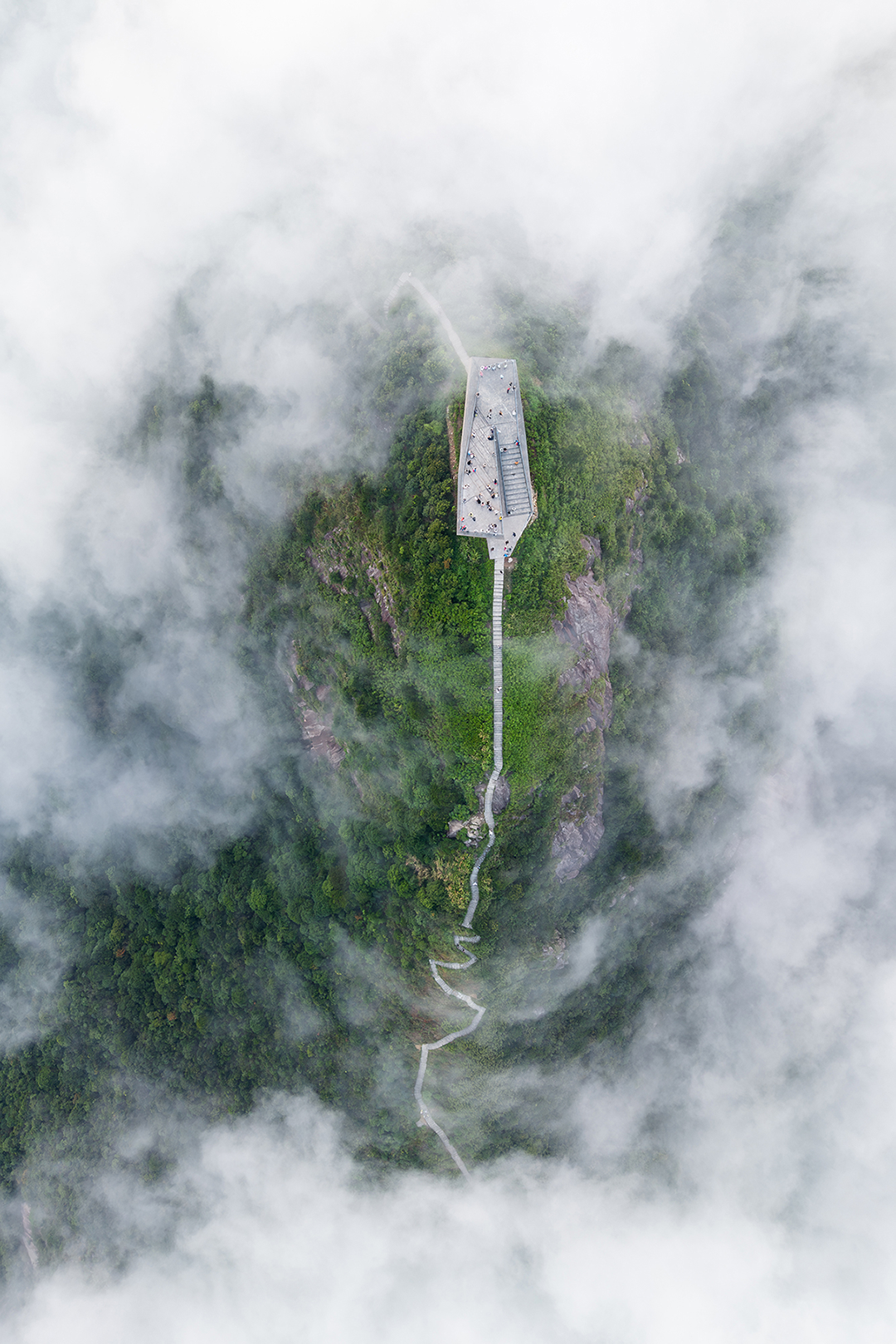 作为登山环线的中转节点,设计拒绝封闭式建筑切割动线。通过Z字形缓坡串联原有石阶,形成无阻隔的穿行体验——登顶者既可驻足观景,亦可自然过渡至下山路径,延续"山行即建筑"的东方意境,也将地景漫游转化为某种登顶仪式。